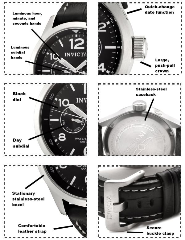 Pouzdro: nerezová ocel průměr: 48 mm tloušťka 13 mm řemínek: kožený, šíře 24 mm sklíčko: tvrzené minerální funkce: datumovka, dny v týdnu vodotěsnost: 100 m strojek: precizní švýcarský quartz