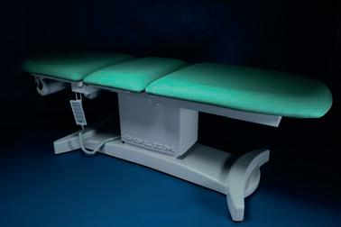 Pracovní plocha s rozměrem 630 × 2 000 mm je potažena koženkou s barvou dle Vašeho výběru a rozdělena na záda, sedák a nohy. Sklon zádového segmentu lze nastavit, sklon sedáku je vždy nastavitelný elektropohonem, nohy zůstávají pevné. Ovládání elektropohonů je standardně ručním ovladačem, změny polohy lze provádět i při plném zatížení.